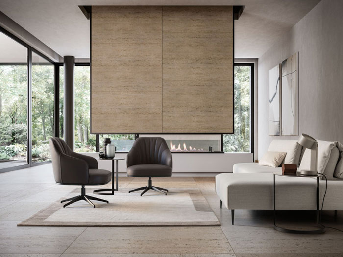 Basamento girevole sorregge la seduta di Aaron, poltroncina incoronata da un elegante schienale dalle cuciture verticali che richiamano le venature di una raffinata conchiglia, protetta e delimitata ai lati da due solidi braccioli dalla dolce inclinazione obliqua.