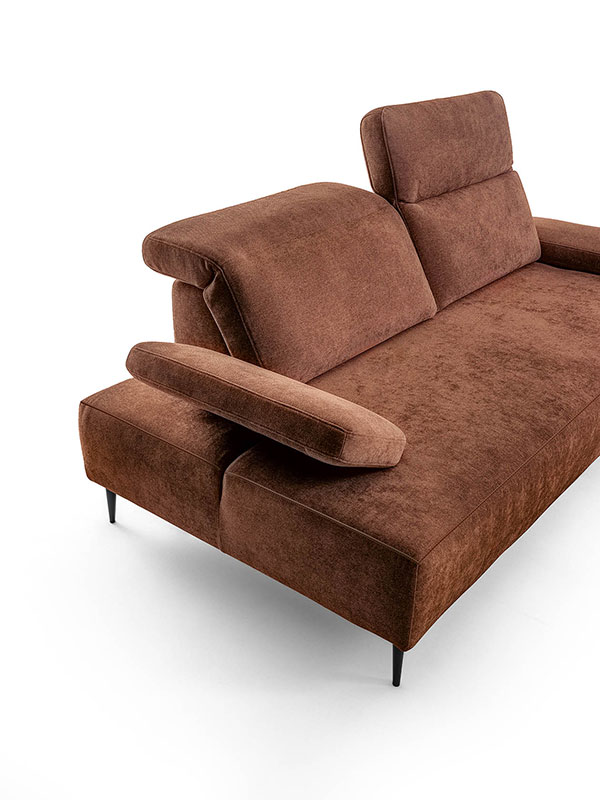 Energico incrocio di geometrie comunicanti, in Astor il particolare abbinamento di seduta avanzante e poggiatesta regolabile mima la profondità della chaise longue laterale, mentre un’inaspettata cucitura a zig zag vivacizza nel mezzo la larga superficie del bracciolo.