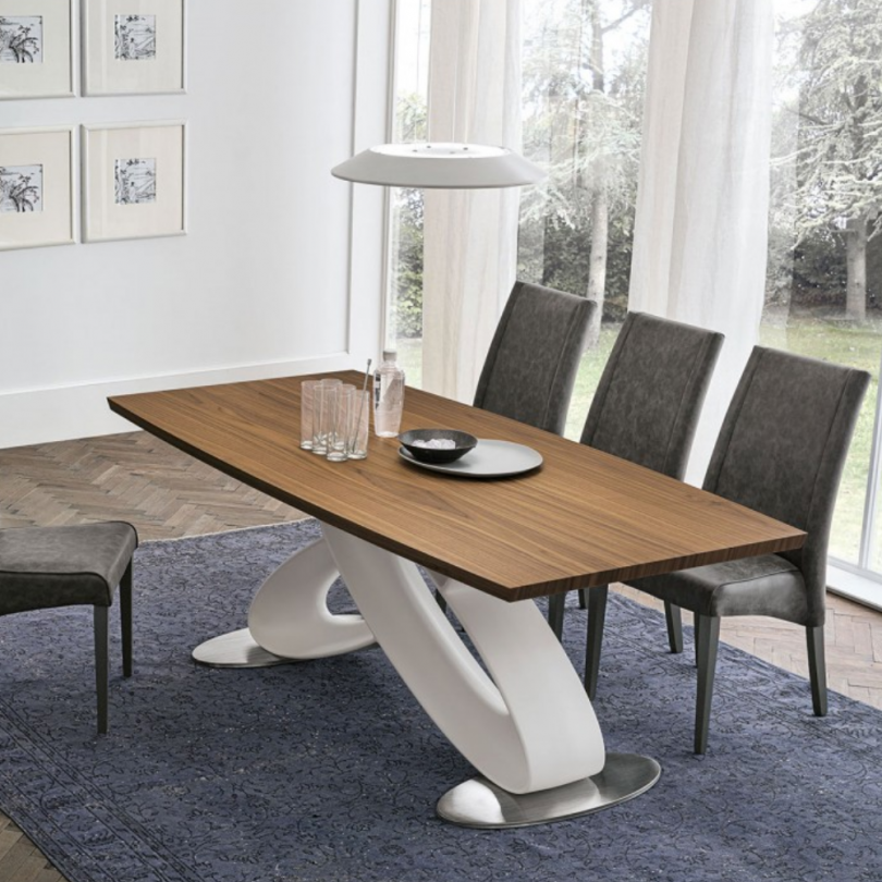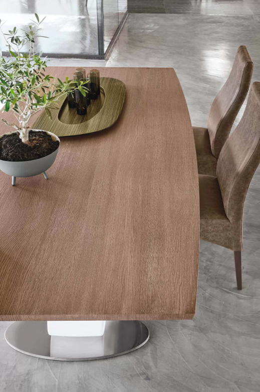 Un tavolo dal basamento centrale scultoreo, che diventa protagonista assoluto della scena, valorizzato dal piano, personalizzabile a seconda dello stile. Per un ambiente dal carattere fuori dal comune.