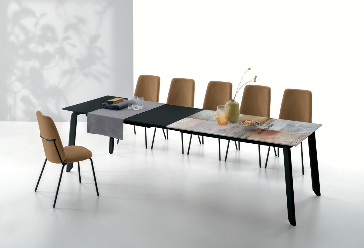 Efesto può ospitare fino a 10-12 ospiti, grazie alla triplice allunga, e può essere adatto a qualsiasi ambiente. Scegli la tua finitura, ce ne sono molteplici: effetto marmo o anche vetro con stampa digitale!