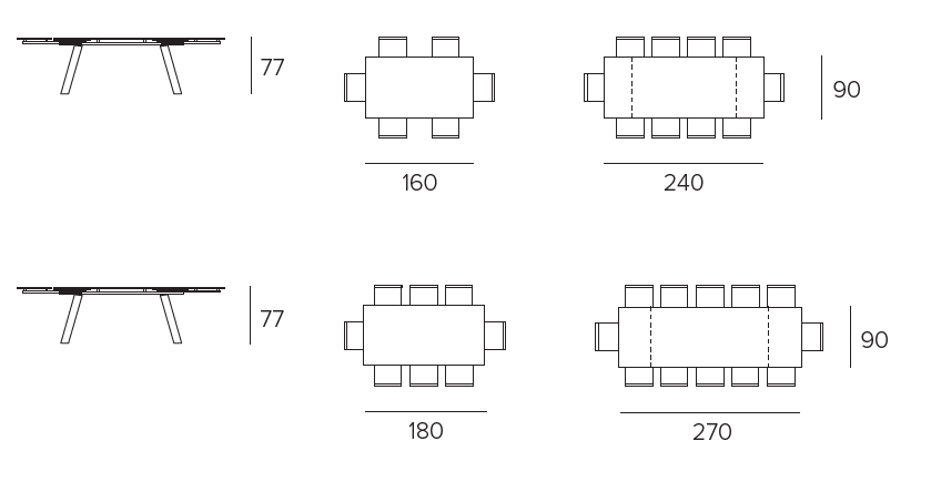 Tavolo allungabile da 160 a 240 o da 180 a 270 cm con struttura in metallo. Piano e prolunghe in laminato effetto legno.