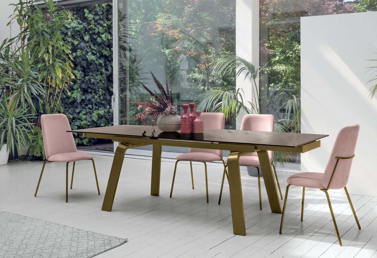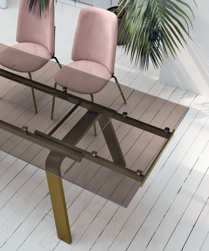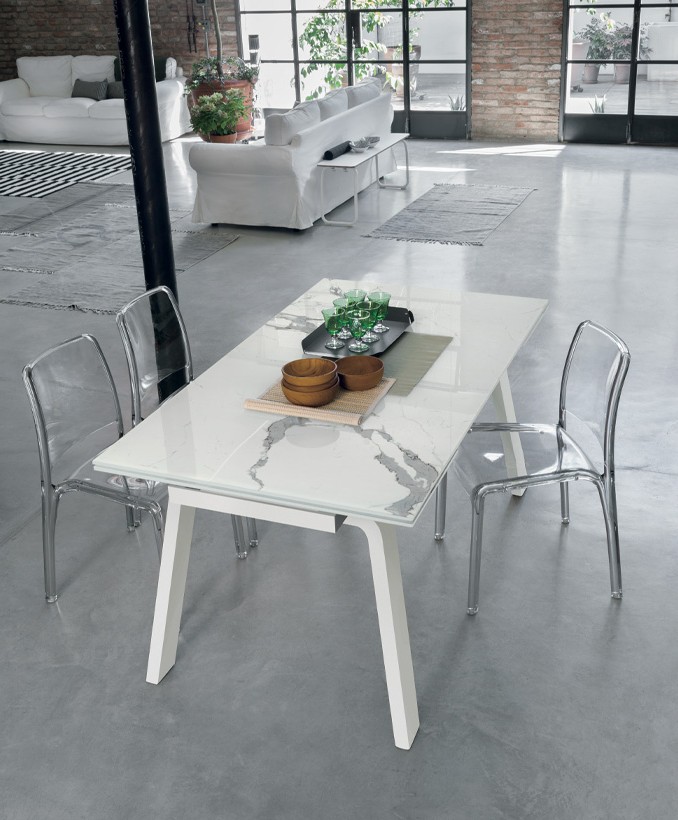 Tavolo allungabile da 160 a 240 cm. Struttura in metallo, piano disponibile in grès opaco o lucido oppure in vetro temperato.