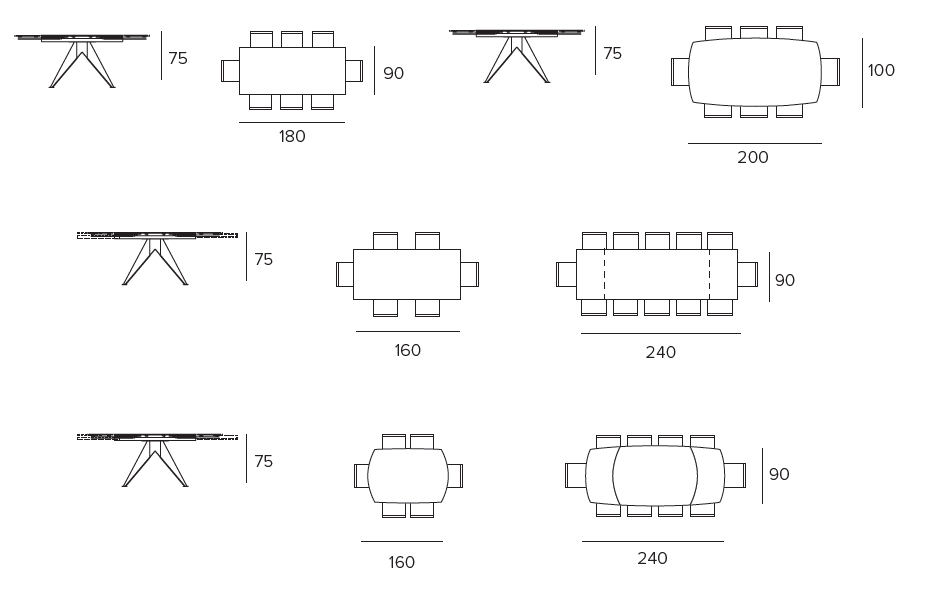 Disponibile con piano fisso rettangolare da 180 cm oppure a botticella da 200 cm. Nella versione allungabile va dai 160 ai 240 cm. Struttura in metallo e piano in grès porcellanato, vetro ondulato o vetro dune.