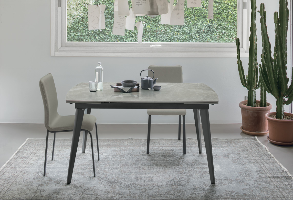 Tavolo per cucina allungabile da 140 a 210 cm con struttura in metallo e piano in grès opaco o lucido.