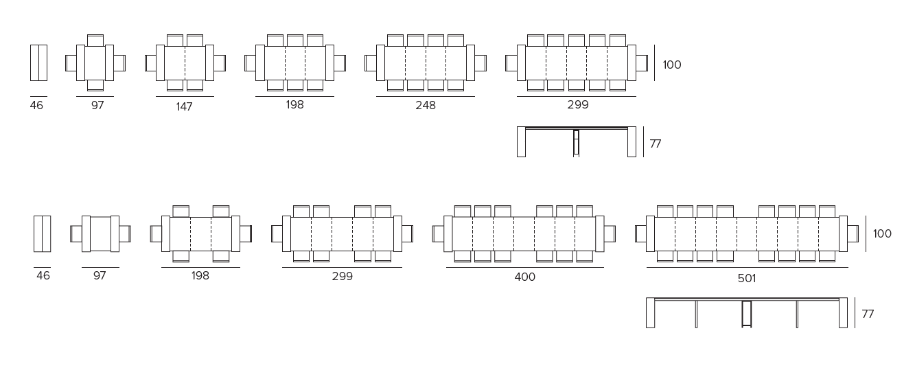 Misure: 110, 130, 160 cm. Struttura in metallo verniciato, piano in grès porcellanato, laminato o vetro temperato e allunghe in MDF laccato in tinta con la struttura.