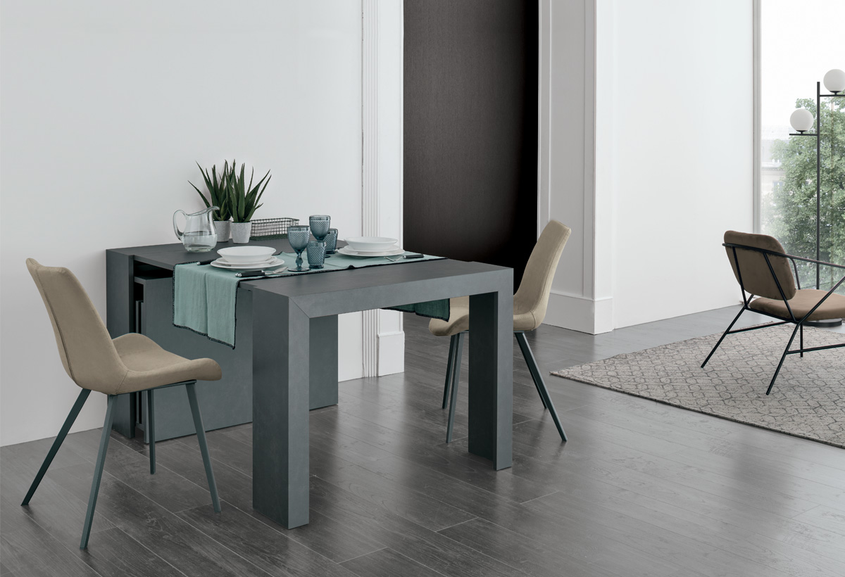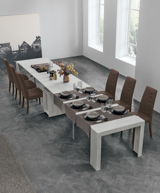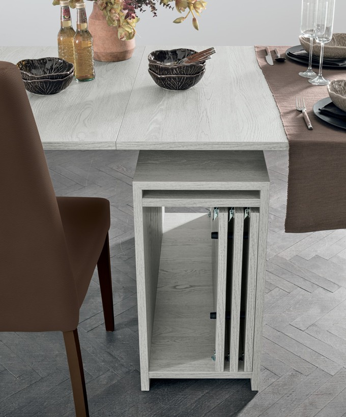 Chiusa occupa soli 46 cm, dispone di allunghe estraibili in laminato per creare un tavolo fino a 5 metri.