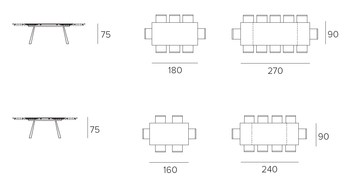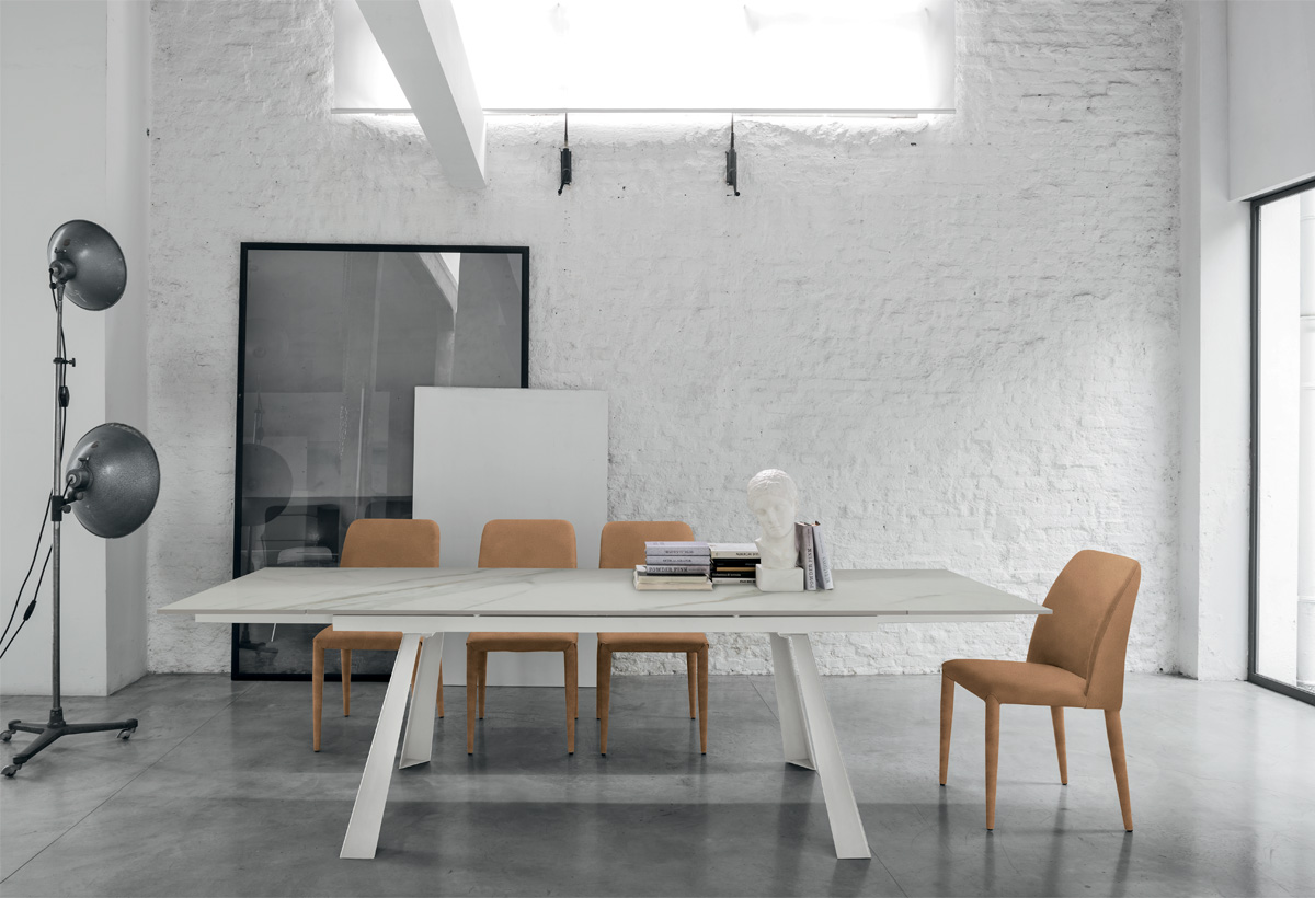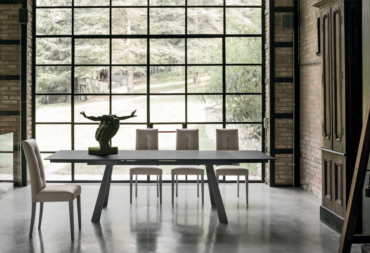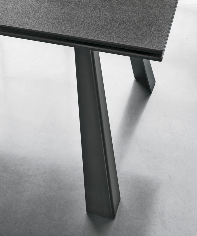 Tavolo allungabile da 160 a 240 cm con struttura in metallo e piano rettangolare disponibile in grès o vetro temperato.