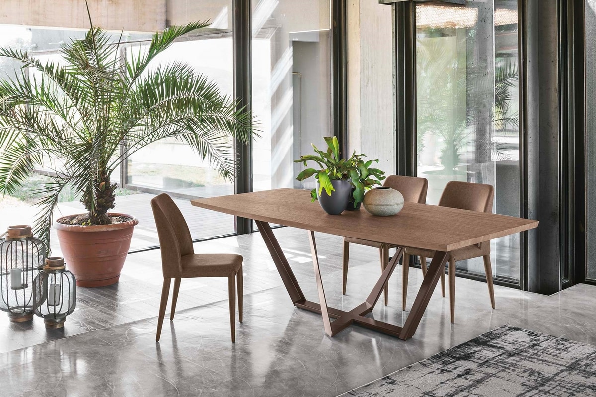 Il basamento di Priamo è un incrocio di direttrici dal forte impatto scultoreo, su cui poggia il piano, fisso o allungabile, dando la possibilità di aggiungere posti a tavola. Un tavolo che coniuga design e praticità.