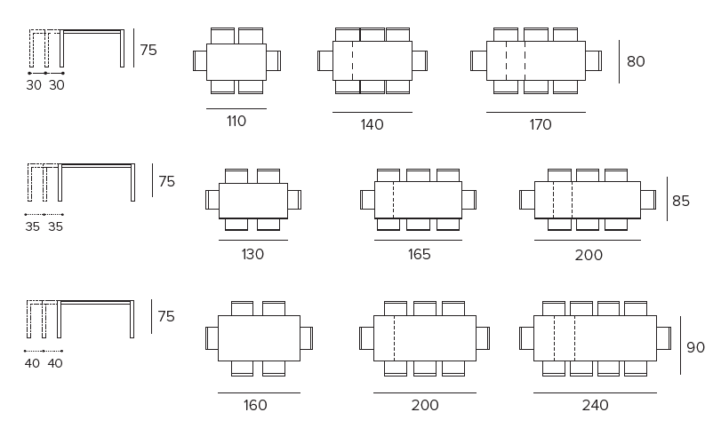Misure: 110, 130, 160 cm. Struttura in metallo verniciato, piano in laminato (effetto legno, malta o marmo), grès porcellanato o vetro temperato e allunghe in MDF laccato in tinta con la struttura.