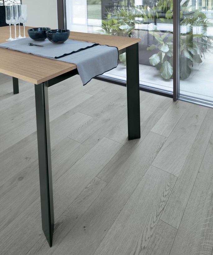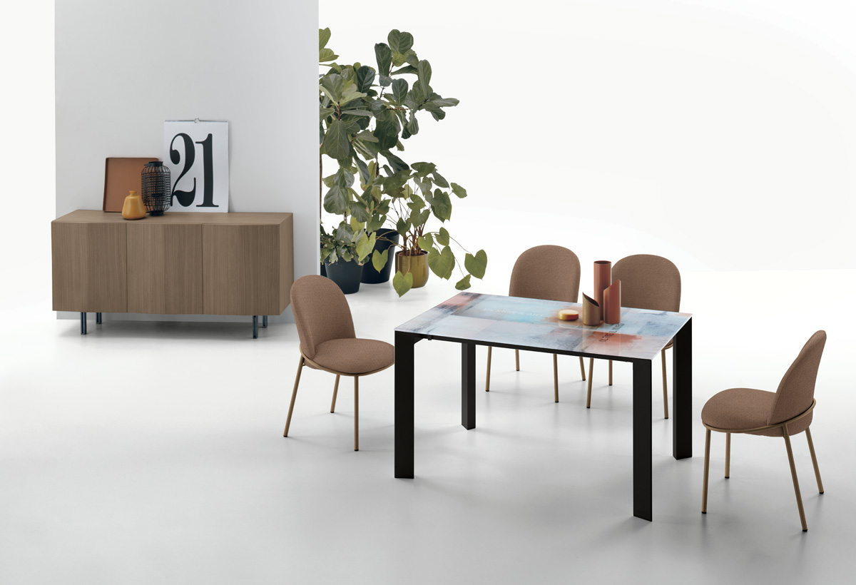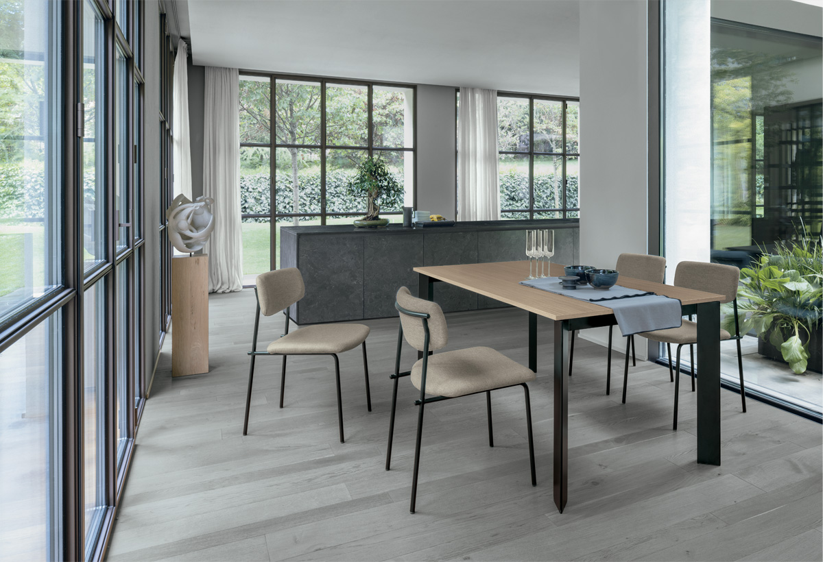 Stile sobrio e moderno per il tavolo Enea: una soluzione pratica per accogliere tutti i tuoi ospiti anche in living ridotti, grazie al comodo sistema di apertura con allunga a scorrimento.