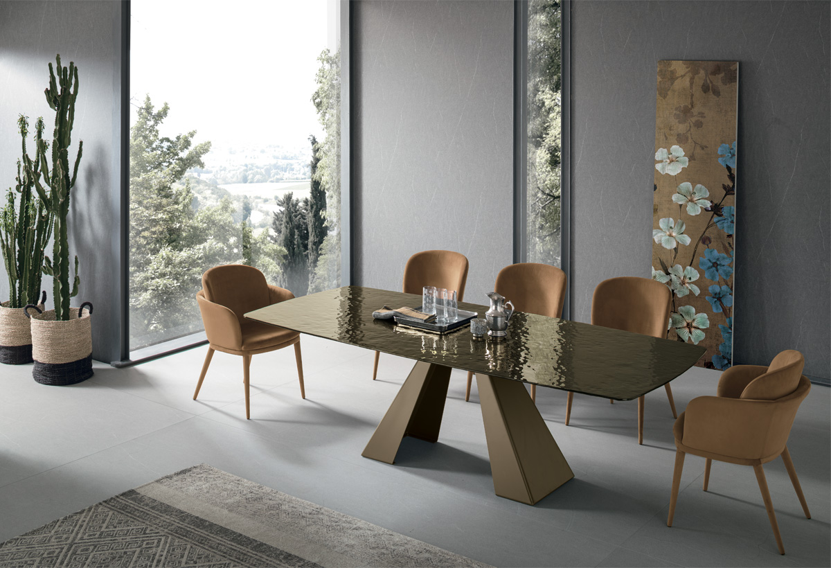 La delicata maestosità del vetro è protagonista assoluta. Un tavolo raffinato per living ampi, dove organizzare pranzi e cene lussuosi con fino a 14 persone.
