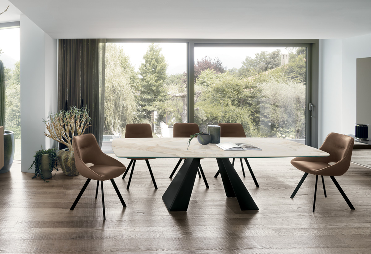 Il basamento di Priamo è un incrocio di direttrici dal forte impatto scultoreo, su cui poggia il piano, fisso o allungabile, dando la possibilità di aggiungere posti a tavola. Un tavolo che coniuga design e praticità.