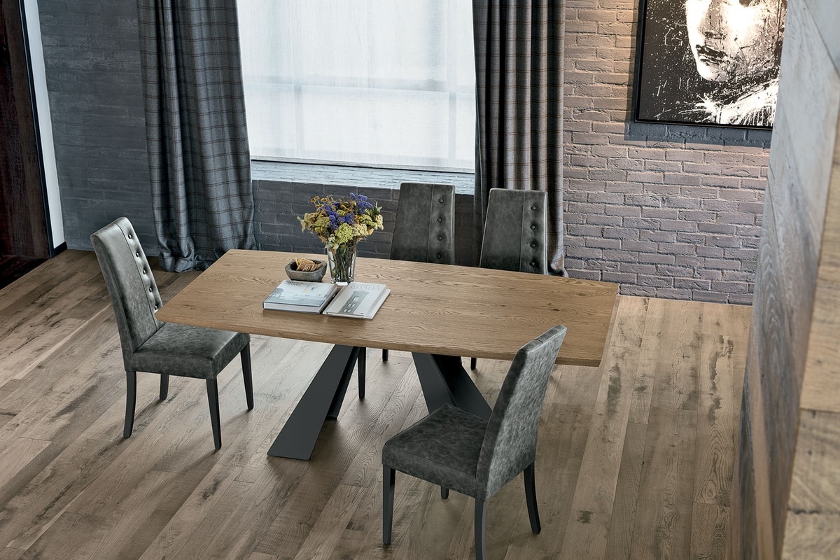 Proposto sia nella versione fissa che allungabile, Taurus va da 160 a 240 cm. Struttura in metallo, piano a botticella o rettangolare in grès porcellanato, legno, vetro dune o vetro ondulato.
