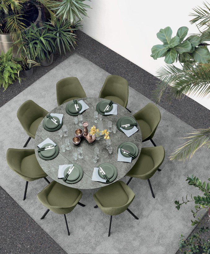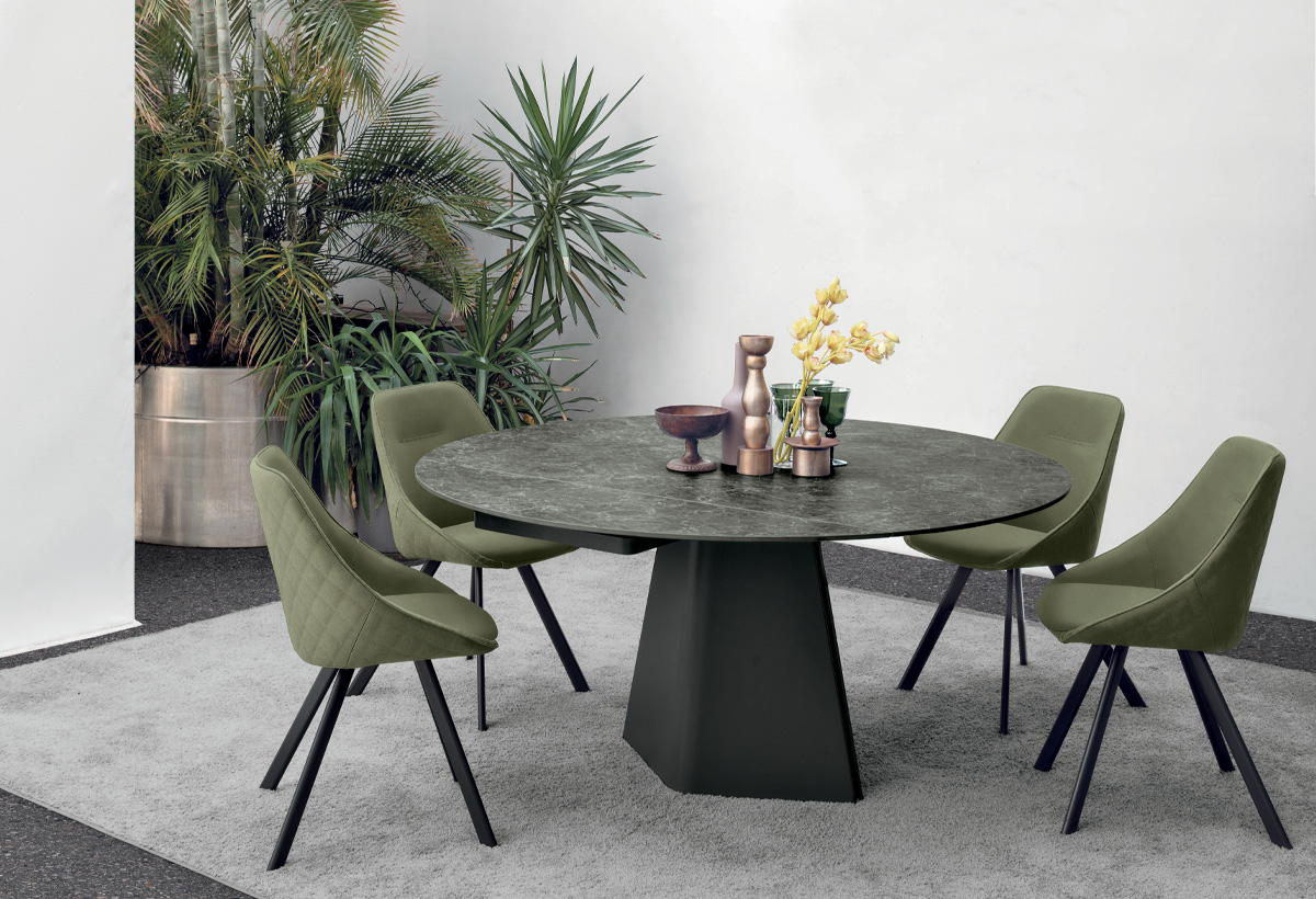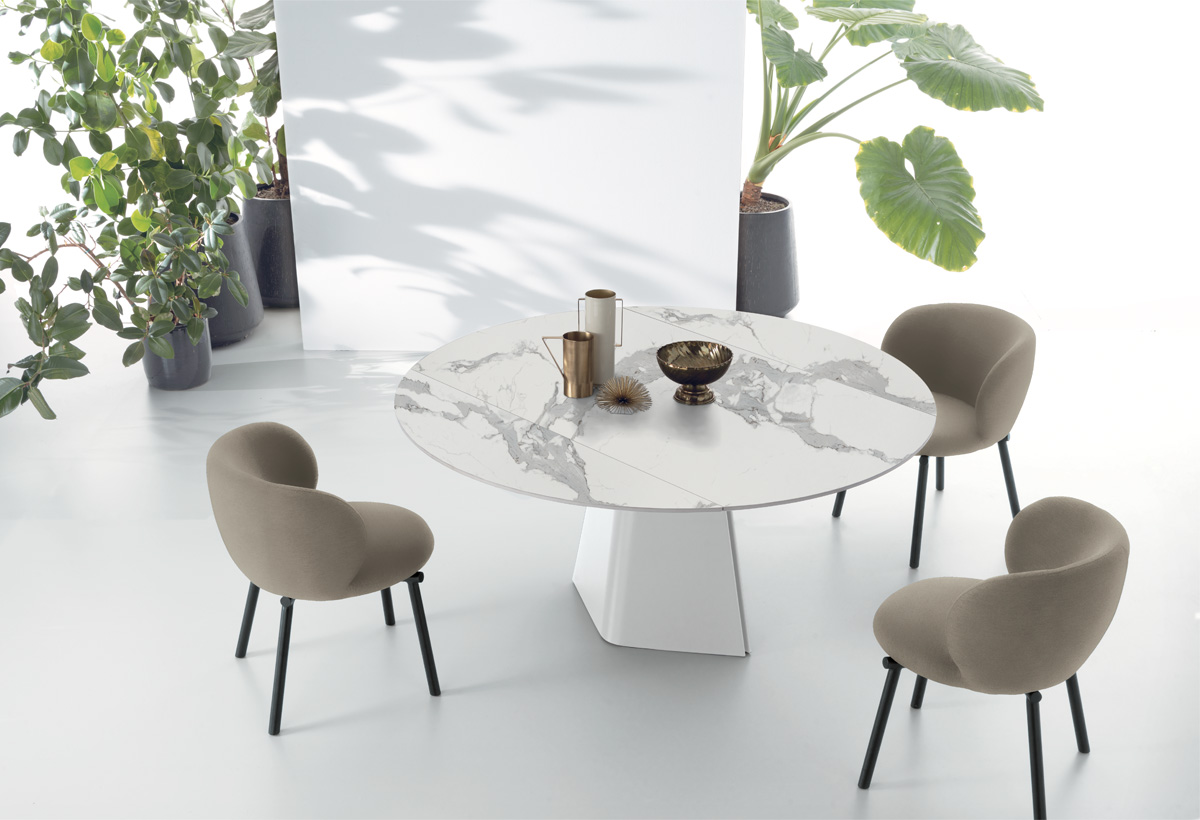 Tavolo con piano a botticella che diventa rotondo, passando da 6 a 8 posti. Basamento in metallo verniciato e piano girevole semiautomatico in gres porcellanato.