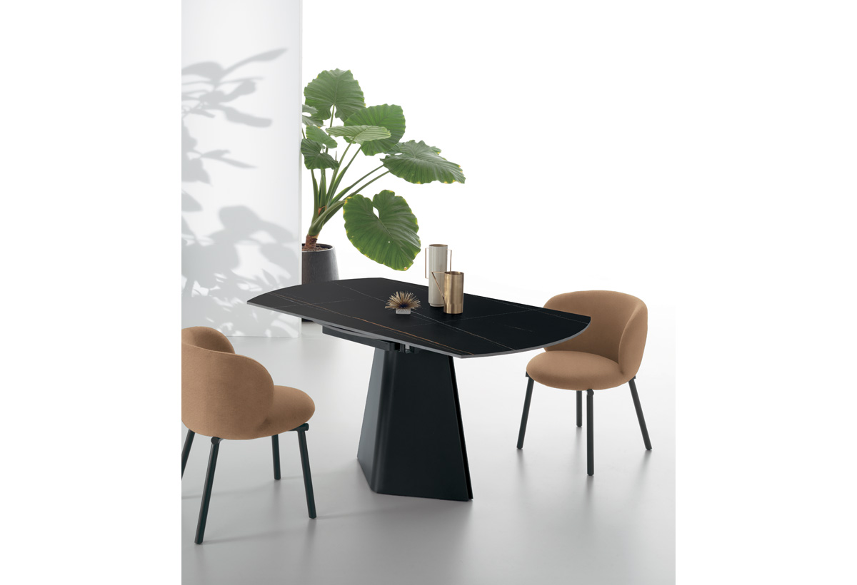Un tavolo dal basamento centrale scultoreo, che diventa protagonista assoluto della scena, valorizzato dal piano, personalizzabile a seconda dello stile. Per un ambiente dal carattere fuori dal comune.